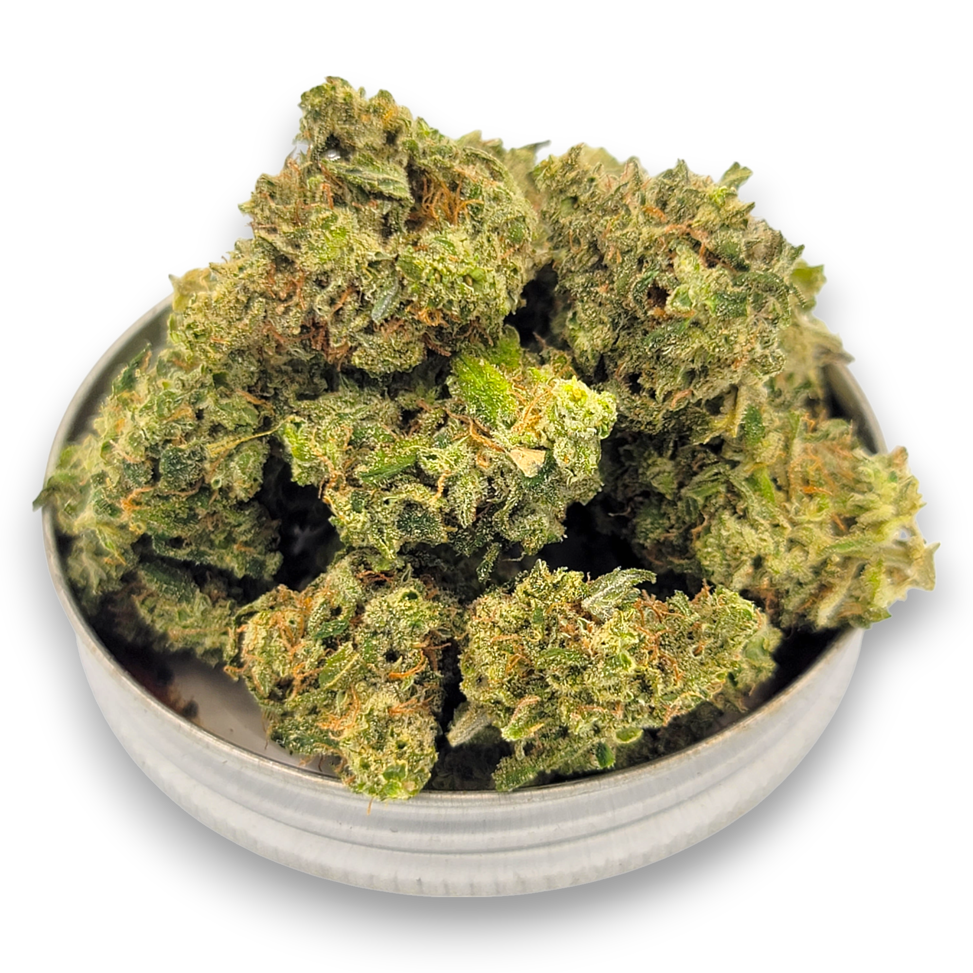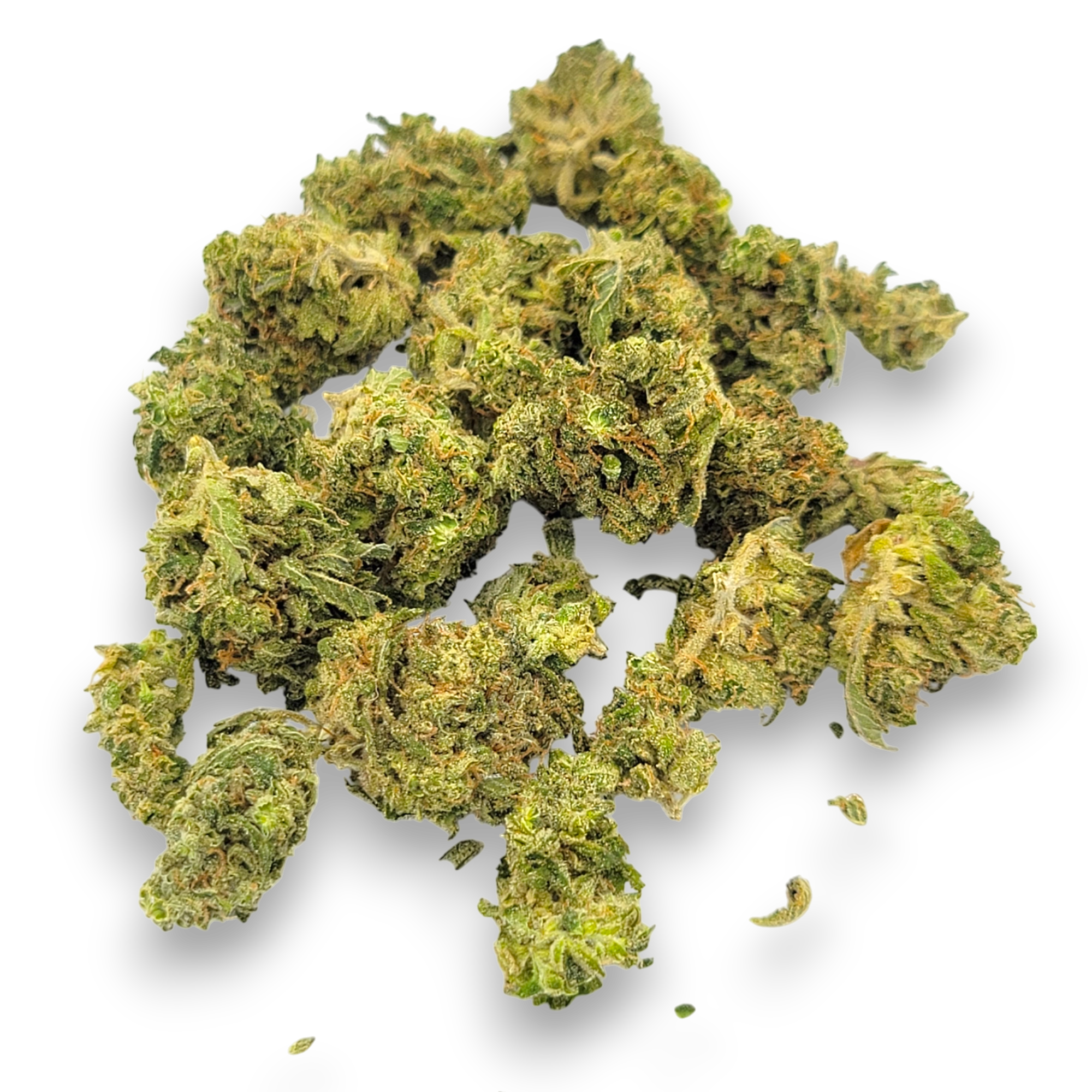 The buds of Bentley OG are visually impressive—large, thick, and fluffy with a vibrant neon green color, mixed with dark olive green leaves. Adorned with fiery orange hairs and a rich layer of trichomes, these buds not only hint at the strain’s potent effects but also its high THC content.